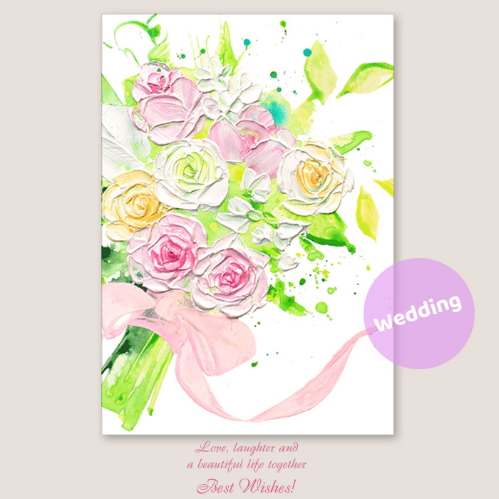 花束に、祝福の想いを重ねて 人生の門出を彩る花束を、色彩と質感で表現しました。ペインティングナイフで重ねた一色一色に、心からの祝福を込めています。このカードが、大切な想いをまっすぐに届ける一枚になりますように。 Masaki Ryo. ← Wedding Greeting Card 〜Caspari(カスパリ)〜 Caspariのハロウィーンシリーズ →